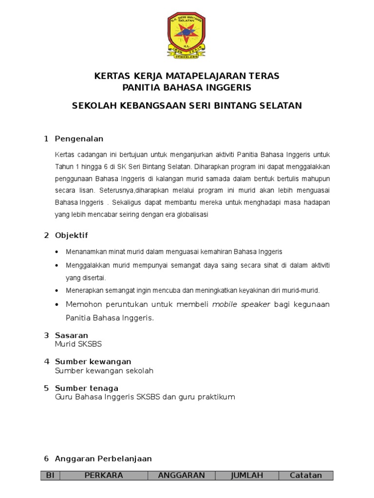 Kertas Kerja Memohon Peruntukan Untuk Panitia Bahasa Inggeris Pdf